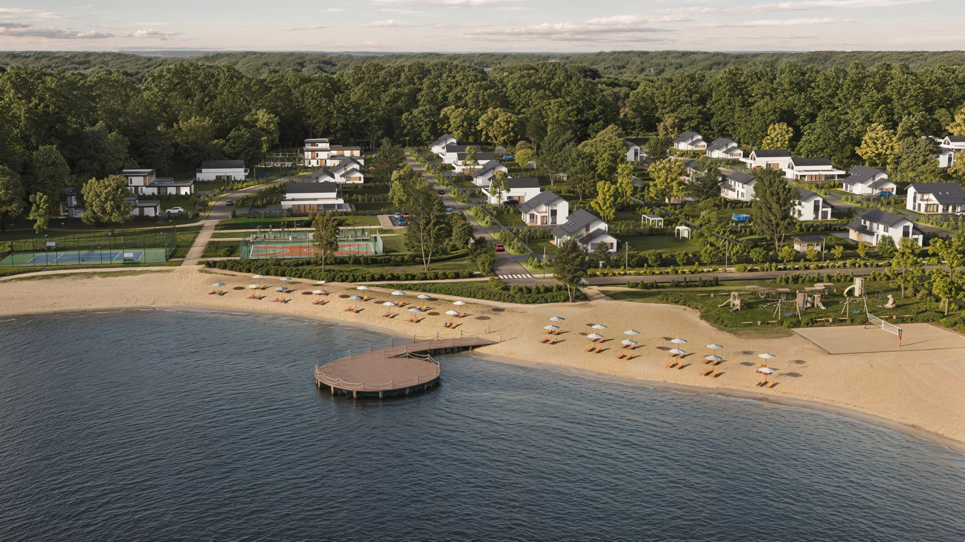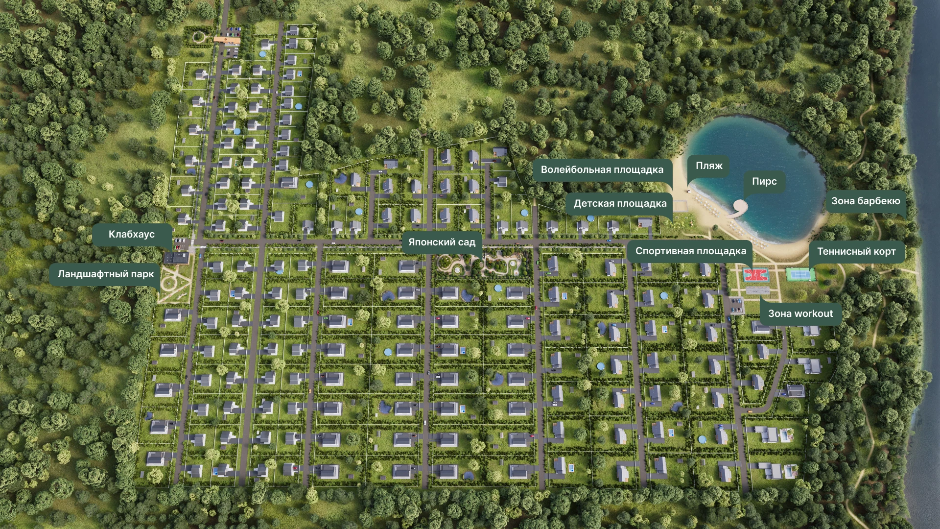 | Элементы благоустройства и инфраструктура внутри поселка | Прогулочная зона, Благоустроенный пляж , Спортивная площадка, Детская площадка, Здание администрации, |