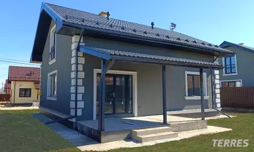 1 этаж: Просторная кухня-гостиная 34 кв.м с окнами на три стороны света и панорамной дверью на крытую террасу 14 кв.м; спальня 13 кв.м; ванная комната; бойлерная; гардеробная; прихожая.